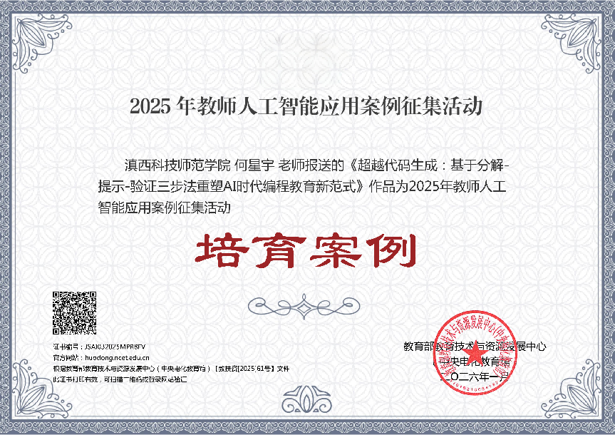 近日,教育部教育技术与资源发展中心(中央电化教育馆)公布了2025年教师人工智能应用案例征集活动结果。我校智能与控制学院青年教师何星宇报送的案例《超越代码生成:基于分解-提示-验证三步法重塑AI时代编程教育新范式》经层层推荐与评审,成功入选“培育案例”类别,展现了学校在探索人工智能与教育教学深度融合方面的积极进展。