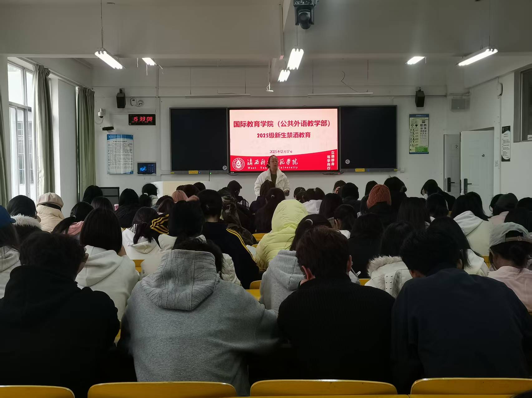 12月17日,国际教育学院(公共外语教学部)开展禁酒主题教育活动,学院党政领导班子、辅导员及2025级全体新生参加。